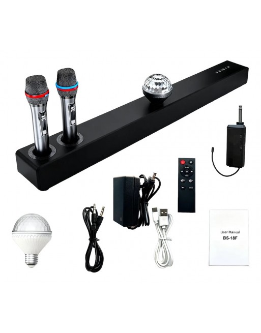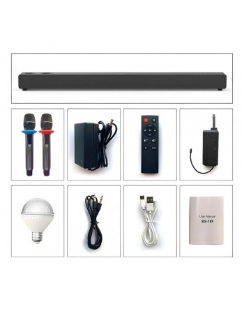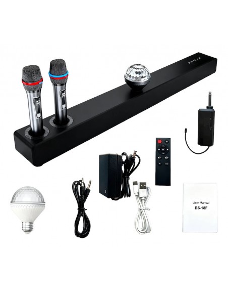 Incluye: control remoto, cable auxiliar, manual y 2 micrófonos