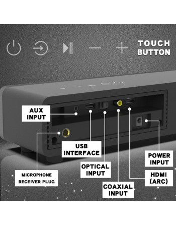 HDMI (ARC), coaxial, auxiliar (3.5 mm), USB, fibra óptica