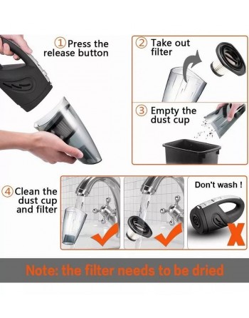 Nuestra aspiradora está equipada con un diseño único de copa de polvo y filtro de alta eficiencia para garantizar un sistema de filtrado de polvo más eficiente, fácil de eliminar partículas como PM2.5, polvo, líquido, pelo, etc. Contenedor de eliminación de polvo desmontable, fácil y rápido de operar. Un botón puede quitar el cuerpo para eliminar el polvo fácilmente. El filtro se puede limpiar con agua y usar repetidamente para mantener la succión fuerte.