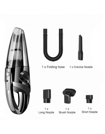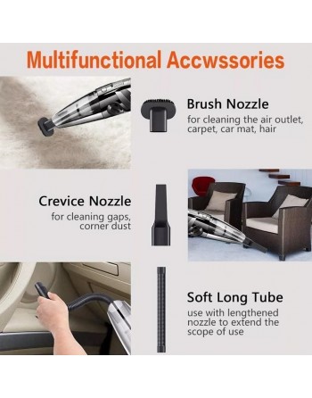 Aspirador de mano con 5 accesorios que le ayudarán a limpiar todas las áreas de difícil acceso. Cepillo de boca para cabello y líquidos; La ranura puede manejar la basura en un espacio estrecho; La manguera suave ayuda a limpiar lugares difíciles de alcanzar. Polvo en las esquinas; La manguera extendida EVA se puede usar con un cepillo pequeño o un boquilla de succión larga para profundizar el espacio y ampliar el rango de uso.
