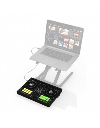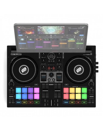 Incorpore su teléfono inteligente o dispositivo de tableta utilizando la amplia gama de conexiones disponibles. La parte superior del controlador cuenta con una base incorporada para un dispositivo de tableta, de modo que puedes montarlo directamente en el controlador para facilitar la navegación y obtener una mayor superficie de control. La interfaz de audio USB integrada permite conectar los altavoces directamente al controlador y comenzar a mezclar desde tus servicios de streaming favoritos a través de la aplicación Djay. No sólo eso, sino que Reloop Buddy también cuenta con una salida RCA, una salida para auriculares y un puerto USB-A dedicado para conectar dispositivos iOS.