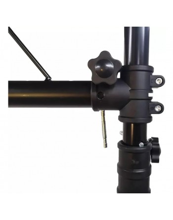 Incluye dos pedestales principales con altura ajustable que varía desde los dos metros hasta un máximo de cuatro metros, permitiendo colocar las luminarias a la altura deseada. Los pedestales cuentan con pernos y tornillos de seguridad de acero para mantener las luces firmemente en su lugar.